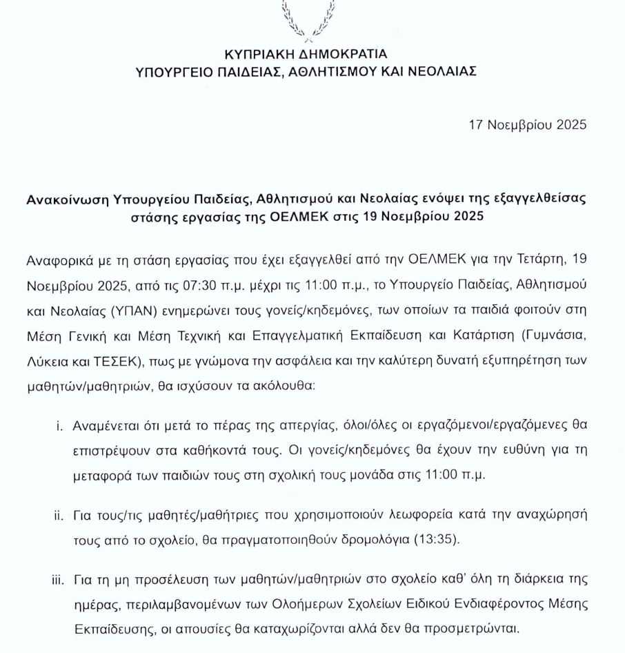 Ανακοίνωση Υπουργείου Παιδείας, Αθλητισμού και Νεολαίας ενόψει της εξαγγελθείσας στάσης εργασίας της ΟΕΛΜΕΚ στις 19 Νοεμβρίου 2025