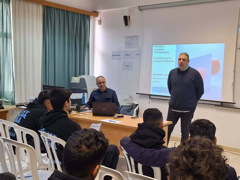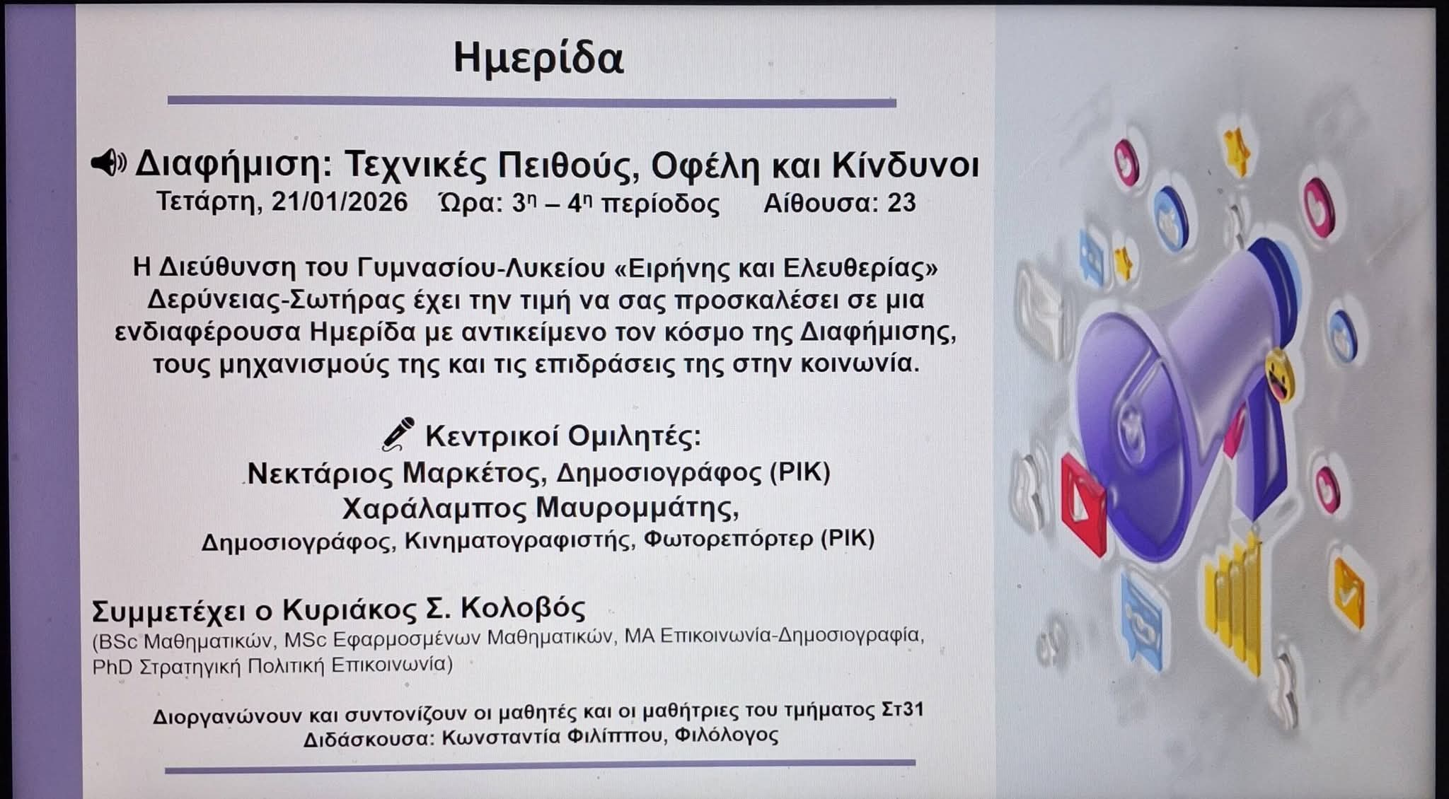 Tην Τετάρτη, 21 Ιανουαρίου 2026, οι μαθητές και οι μαθήτριες της Γ΄ Λυκείου του Γυμνασίου -Λυκείου "Ειρήνης και Ελευθερίας" Δερύνειας - Σωτήρας είχαν την ευκαιρία να συμμετέχουν σε Ημερίδα με θέμα: "Διαφήμιση, Τεχνικές πειθούς, Οφέλη και Κίνδυνοι". Κεντρικοί ομιλητές ήταν ο κ. Νεκτάριος Μαρκέτος, Διαφημιστής - Δημοσιογράφος (ΡΙΚ) και ο κ. Χαράλαμπος Μαυρομμάτης, Δημοσιογράφος, Κινηματογραφιστής και Φωτορεπόρτερ (ΡΙΚ). Στην Ημερίδα συμμετείχε με δική του παρέμβαση ο εκλεκτός συνάδελφος, κ. Κυριάκος Κολοβός. Την Ημερίδα διοργάνωσαν και συντόνισαν οι μαθητές και οι μαθήτριες του τμήματος Στ31, μετά από δική τους πρωτοβουλία. Τα παιδιά είχαν την ευκαιρία μέσα από μία γόνιμη συζήτηση μαζί τους να αντιληφθούν τους μηχανισμούς, που υιοθετεί η Διαφήμιση αλλά και τις επιδράσεις της γενικότερα στο κοινωνικό σύνολο.